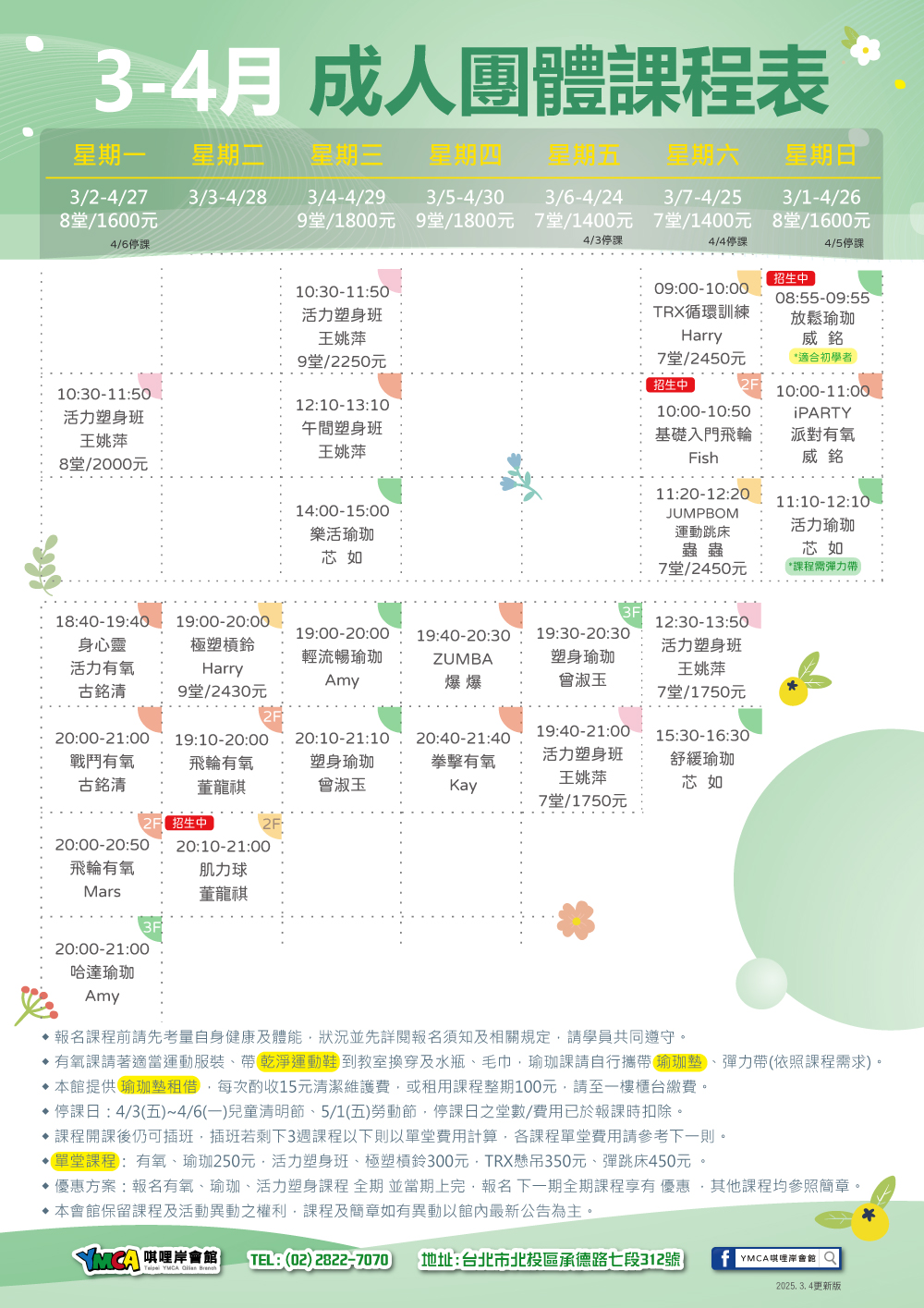 3-4月成人有氧瑜珈課程表